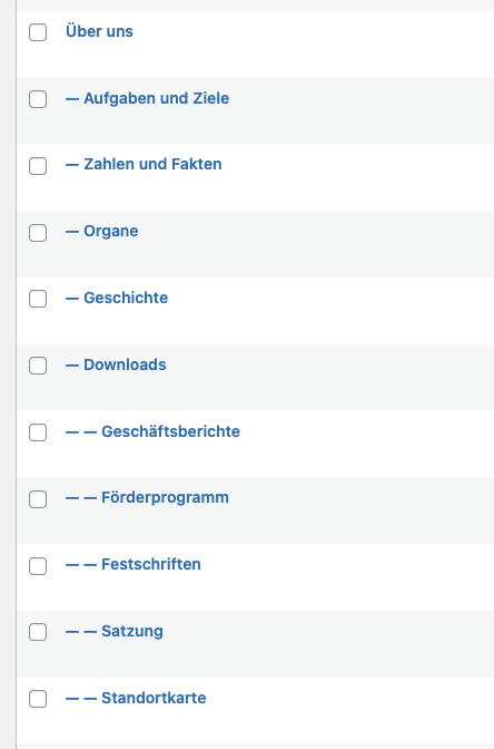 Seiten im Frontend der Website haben keine Unterseiten, sondern die Inhalte der Unterseiten werden als Abschnitte der übergeordneten Seite angezeigt, die über die Navigationspunkte “angespungen” werden (die Seite scrollt dann an die Position).